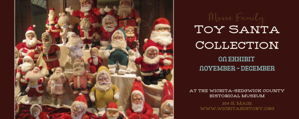 In the lobby of the Wichita-Sedgwick County Historical Museum, from the Wreath Festival through the New Year, visitors will find the Moore Family Santa Dolls on display. As a yearly tradition that has continued for the last 17 years, the Museum has exhibited a small selection of the Moores collection which comprises about 150 items in total for the public to admire. These antique Santas come in various sizes, colors, and expressions. Its hard to pick a favorite!