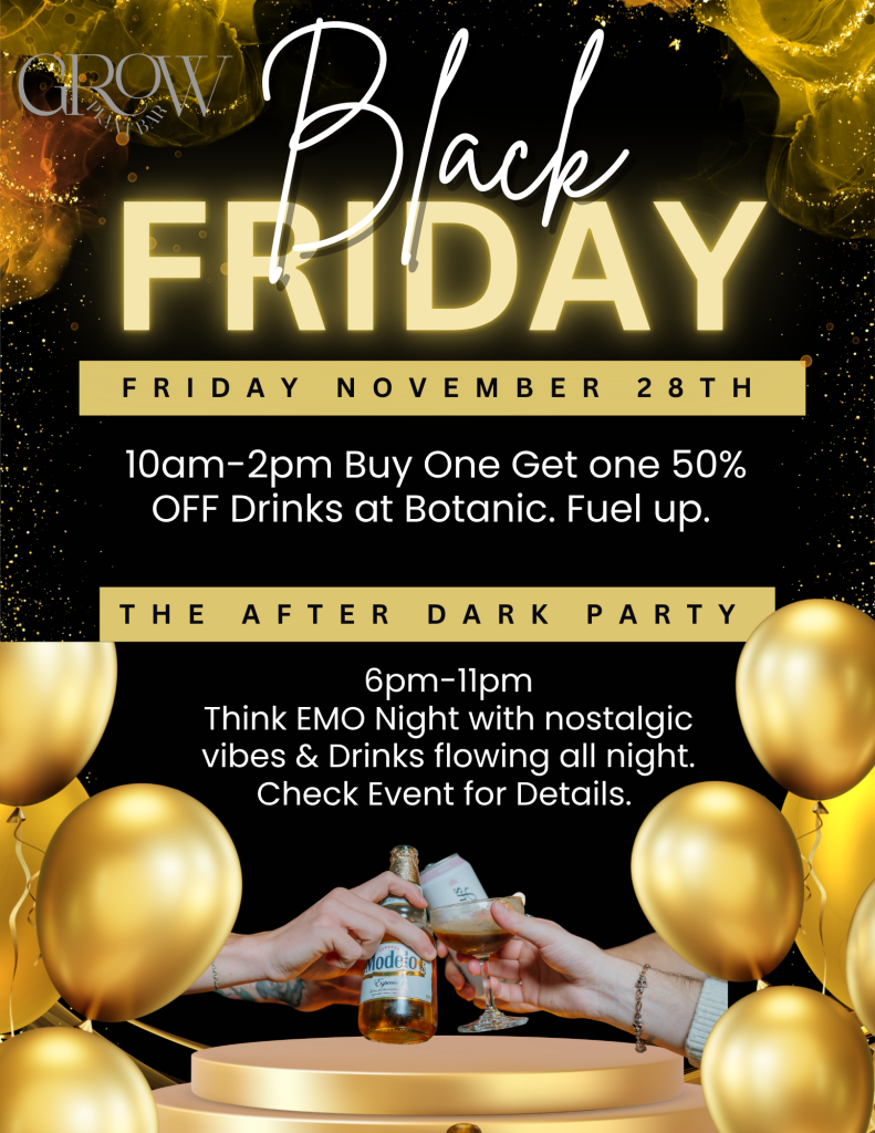 Buy one, get one 50% off drinks at Botanic a little caffeine and cocktail therapy to get you through the chaos of Black Friday.