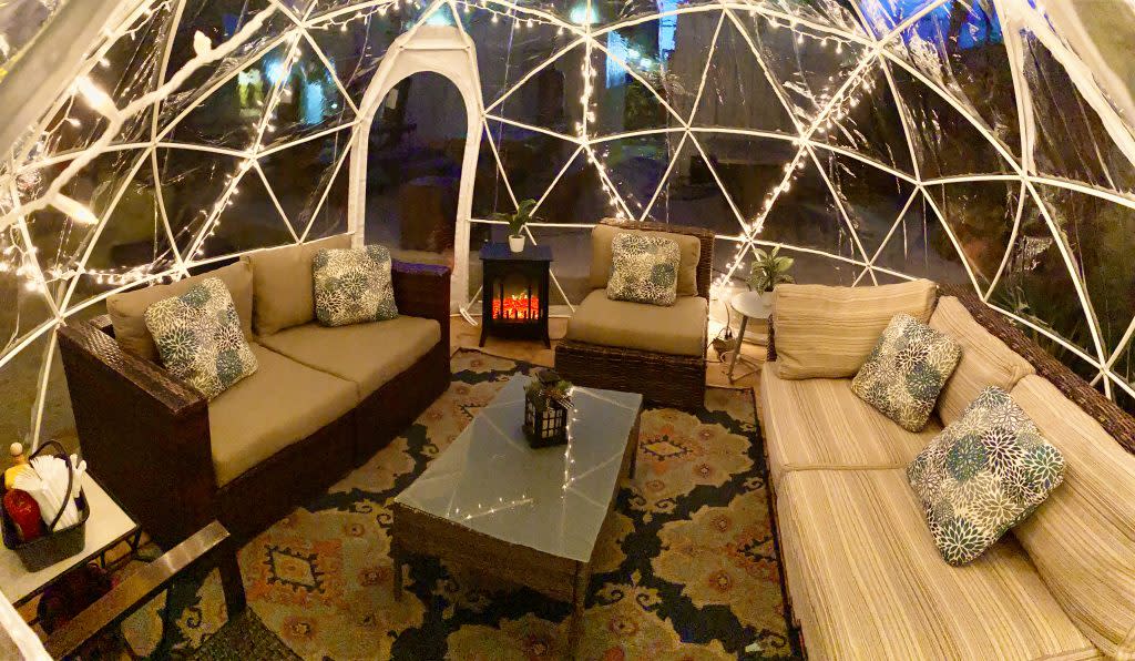 Each igloo has its own cozy electric fireplace heater, a dedicated Bluetooth speaker and seating for up to 8 people. We block off every igloo for 30 minutes after each guest to clean and sanitize. Our full food and drink menus will be offered with a server to take care of anything you need.