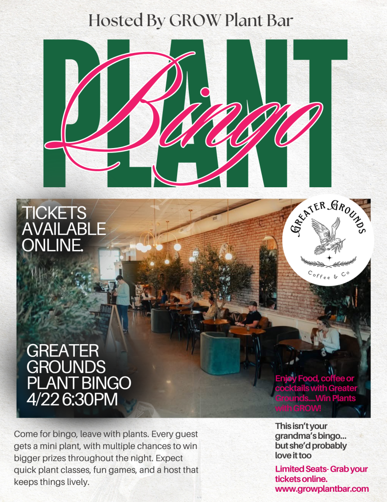 Join GROW Plant Bar for a Plant Bingo night at Greater Grounds. It's Earth Day!